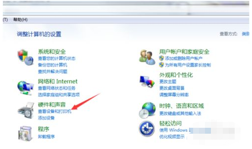 1.将打印机的线与电脑的线连好,然后打开win7系统的控制面板,点击“硬件和声音”下方的“查看设备和打印机”选项;