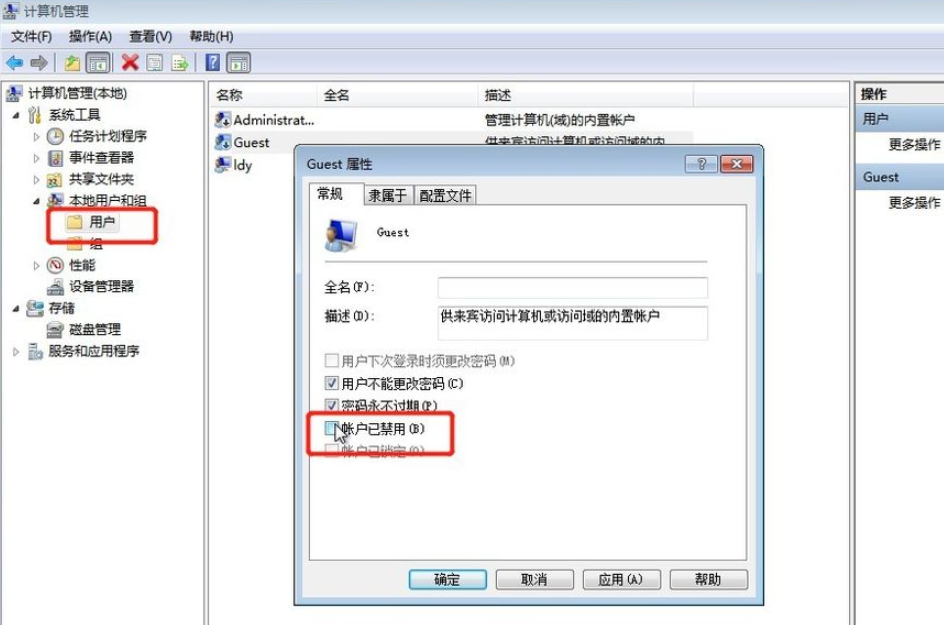 1、右键win7电脑的计算机图标,选择管理打开。然后在弹出的计算机管理界面依次选择系统工具->本地用户和组->用户打开,双击打开右边的guest选项,然后去掉勾选账户已禁用。