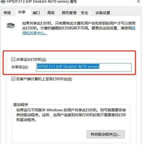 5、切换到【共享】选项卡,勾选【共享这台打印机】的选项,然后自己设置一个共享名。