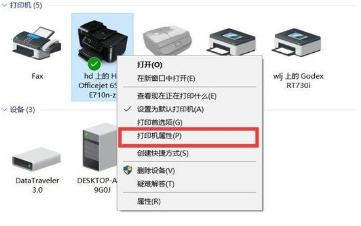 4、点击【开始】图标,选择【设备和打印机】,在弹出的窗口中自己想共享的打印机,在该打印机上鼠标右键,点击【打印机属性】。