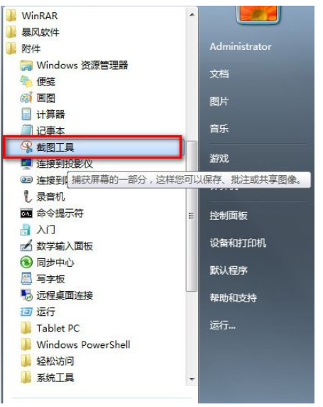 1、点击左下角的“开始”图标、“所有程序”、“附件”、“截图工具”。