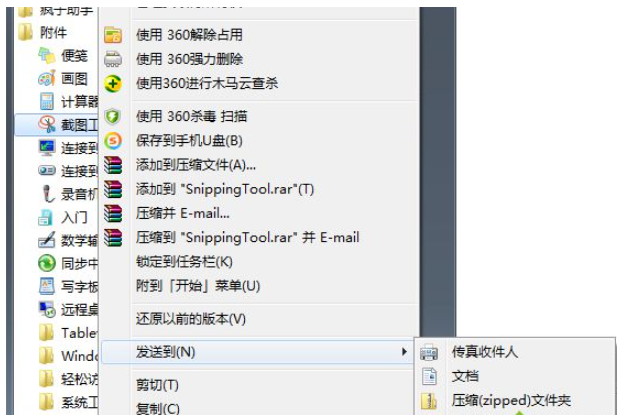2、右键单击“截图工具”,选择“发送到”、“桌面快捷方式”。