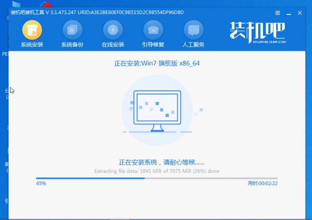 1、安装好装机吧一键重装系统软件并打开,下载安装win7的64位系统