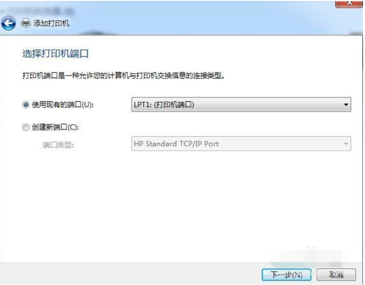 4、在“选择打印机端口”页面进行选择,一般都是现有的打印机端口,直接选择就可以,特殊情况就需要选择“创建新端口”。
