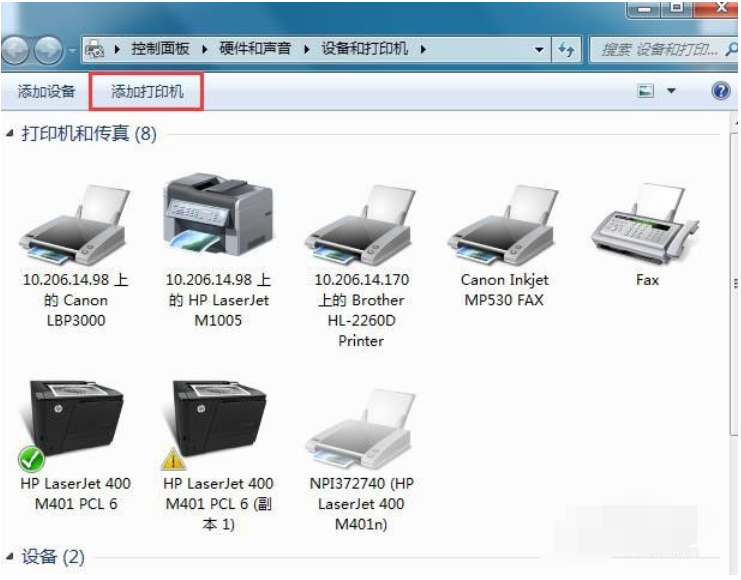 2、进入“设备和打印机”页面后,找到并点击“添加打印机”按钮选项。