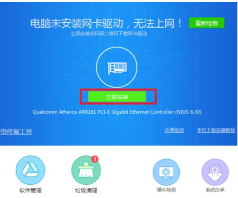 安装驱动精灵网卡版软件检测修复网卡驱动;