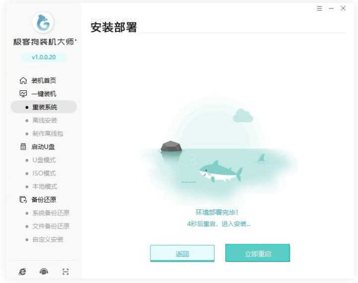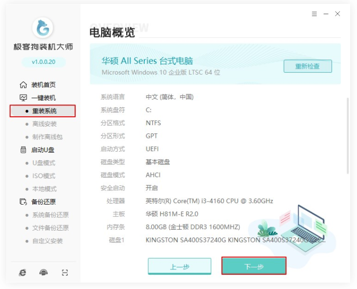1、下载并安装极客狗装机大师(原黑鲨),双击打开,进入“重装系统”页面,等待软件检测完电脑配置信息后点击“下一步”。