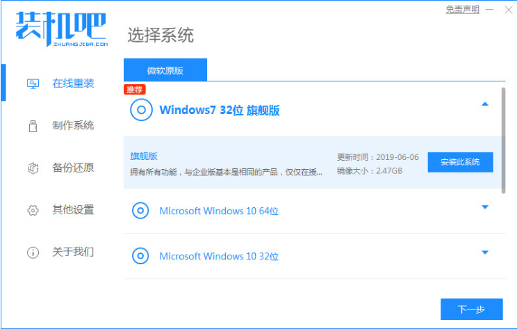 步骤一:下载安装装机吧一键重装系统安装到电脑上并打开,点击在线重装,选择win7系统版本进行下载。