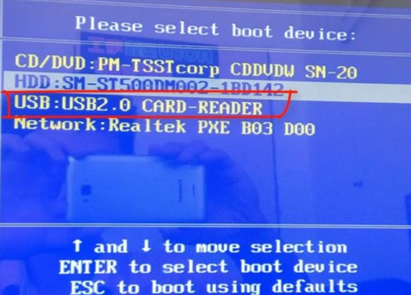 4、把u盘插入要装系统的电脑,开机按热键进入启动项,选择USB项再点回车。