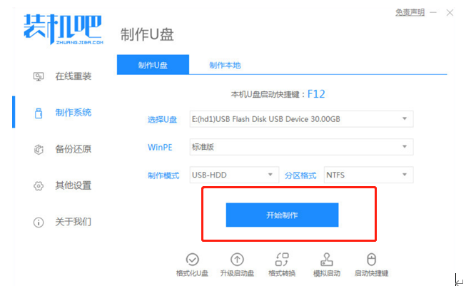 1、下载安装装机吧工具软件,插入U盘,选择点击制作系统。