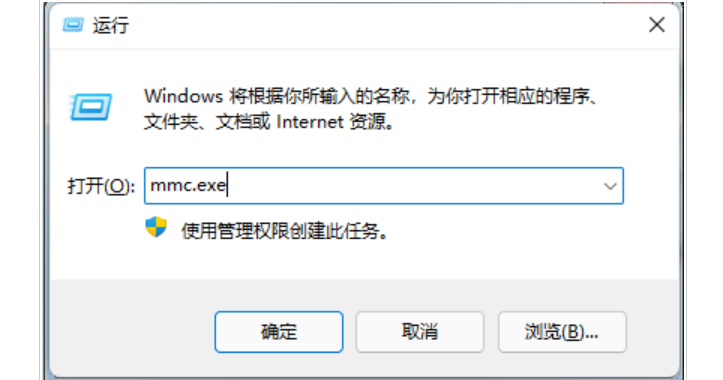 1、按下快捷键“win+R”打开运行窗口,输入mmc.exe,点击确认;