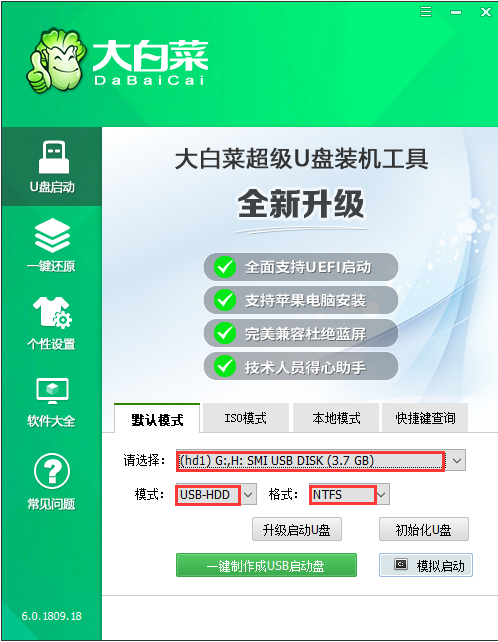 2、 点击“默认模式”,在磁盘列表中,我们选择需要制作启动的设备,在模式选项中点击“USB-HDD”,格式点击“NTFS”即可。