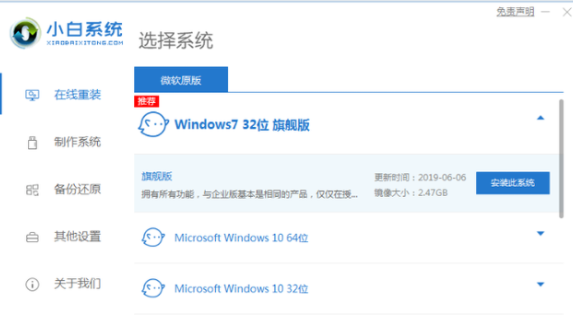1、下载并打开小白一键重装系统,选择win7系统,点击安装此系统。