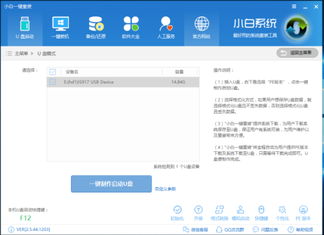 1.将u盘插入电脑,然后下载安装并运行小白一键重装工具,点击一键制作启动u盘,进入下一步。