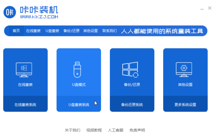 1、网上搜索咔咔装机然后下载这个咔咔装机软件,并将u盘插入电脑。然后选择“U盘模式”进入。