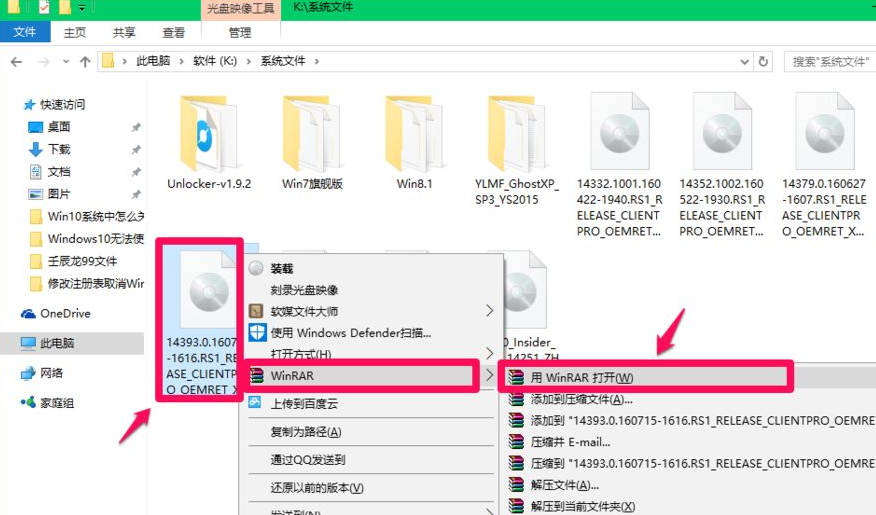 1、解压下载的ISO系统镜像文件。找到保存ISO系统镜像文件的磁盘,右键点击ISO的虚拟光盘文件,在右键菜单中点击:WinRAR - 用WinRAR打开。