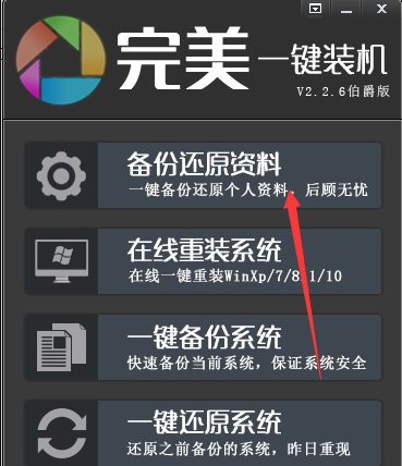 1、下载完美一键装机的压缩包,解压后,双击exe文件。然后运行打开后,点击备份还原资料。