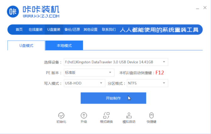 1、在一台可用的电脑中打开浏览器搜索咔咔装机官网,并下载咔咔装机一键重装系统软件,下载完成后并打开,接着我们插入一个8g内存以上的空白u盘,选择u盘重装系统功能,点击开始制作。