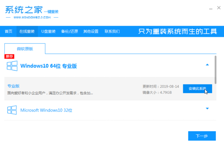 1.在电脑上下载安装系统之家,一键重新安装系统工具并打开,选择需要安装的系统,点击安装系统。(安装前注意备份重要信息,关掉电脑上的杀毒软件,避免被拦截)