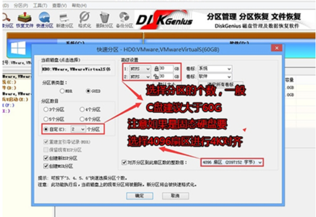 3、在弹出的【快速分区】界面,选择好分区的类型GUID和分区的个数以及大小,一般推荐C盘大小大于60G比较好,然后注意如果是固态硬盘要进行4K对齐,如下图所示;
