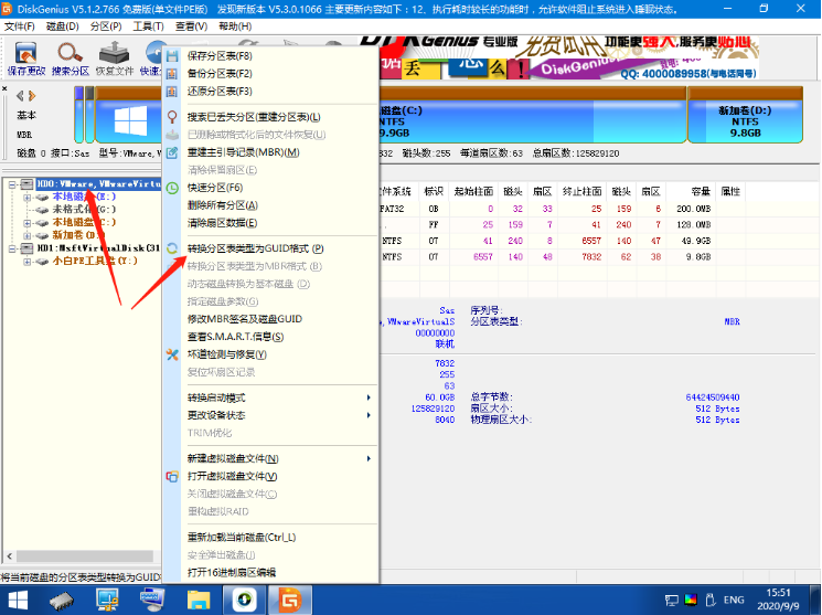1、选择U盘启动盘进入PE后,在桌面上运行DiskGenius分区工具,点击菜单栏的【硬盘】,选择【转换分区表类型为guid格式】,然后保存更改,如下图所示。