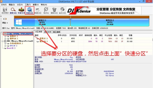 2、然后选择要分区的硬盘,点击上面快速分区。