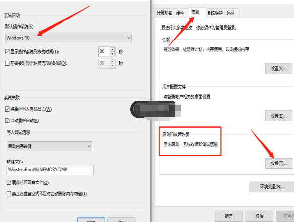 3、找到启动和故障恢复区域,点开设置,确定我们的默认系统是win10。