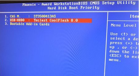5、选择“USB-HDD”(u盘选项),然后按加减号或F5/F6或PageUP/PageDown,将该选项移动到第一位置。最后,按F10回车重启即可U盘启动进入pe内重装系统。