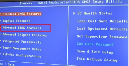 3、按下bios启动热键后便可进入bios中,如果出现的是以下这种界面,我们就使用↑↓方向键移动到“Advanced BIOS Features”回车。