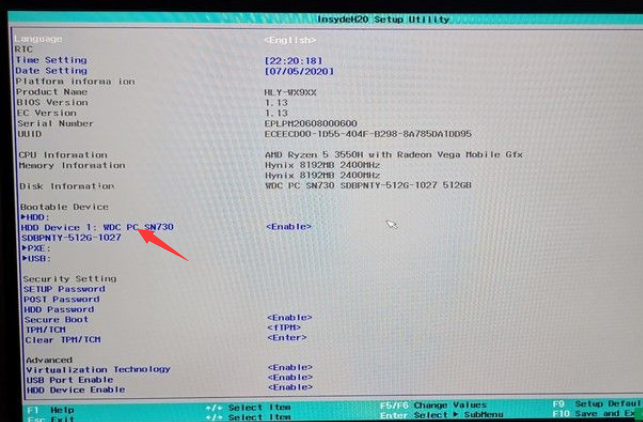 6、如果出现的是以下这种界面,那么操作更加简单,使用方向键移到bootable device内,选择hdd启动项,将其改成u盘启动回车确定并按f10保存设置即可。