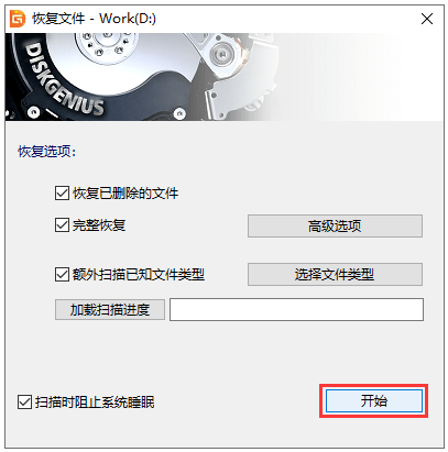 2、然后在恢复文件窗口上,点击"开始"按钮,开始对硬盘进行完整扫描。