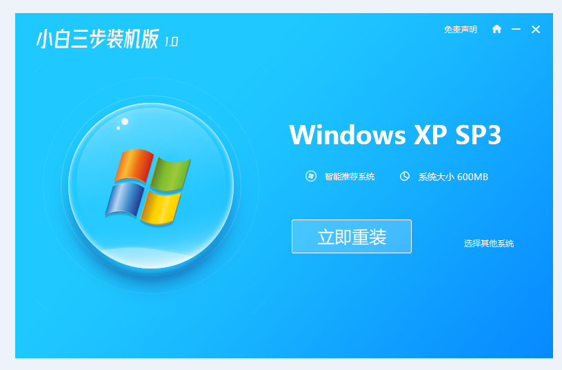 1.首先在官网中下载并安装”小白三步装机版“软件,随后打开软件,选择本次需要重装的windows xp系统,点击”立即重装'。