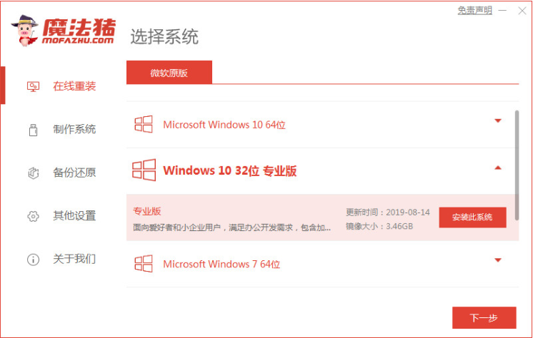 1、下载安装魔法猪装机工具并打开,选择需要安装的系统版本,点击下一步。
