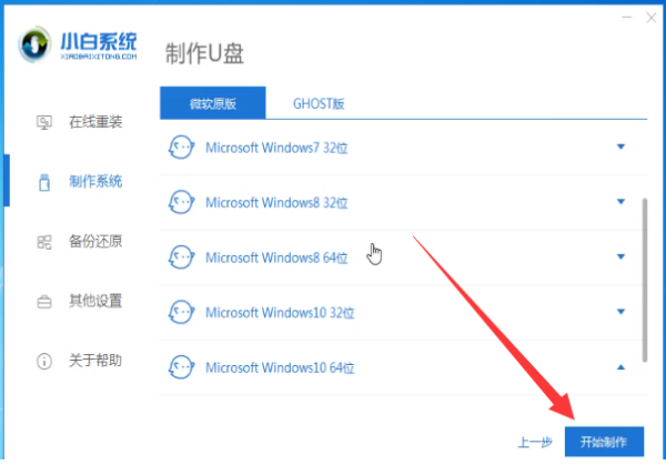 步骤二:选择微软版本windows10系统,点击【开始制作】。