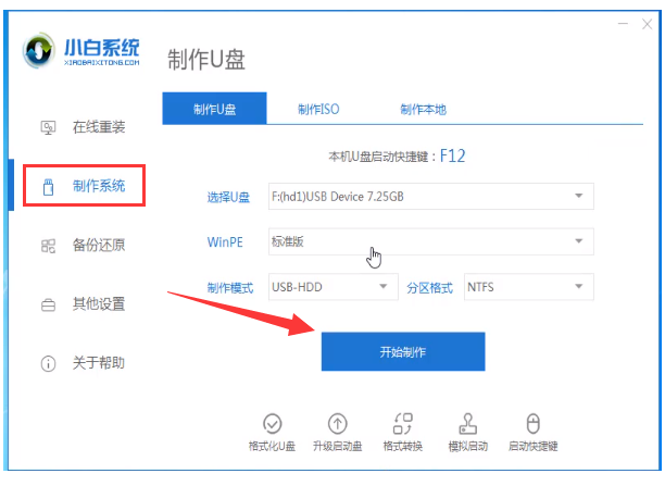 步骤一:首先打开电脑将空白U盘插入电脑,打开小白一键重装系统软件,等待小白检测环境完成之后,点击制作系统,【开始制作】。参考下图: