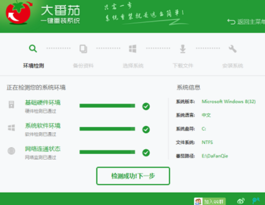 1、下载安装好的大番茄一键重装系统软件,点击“立即重装系统”进入环境检测。