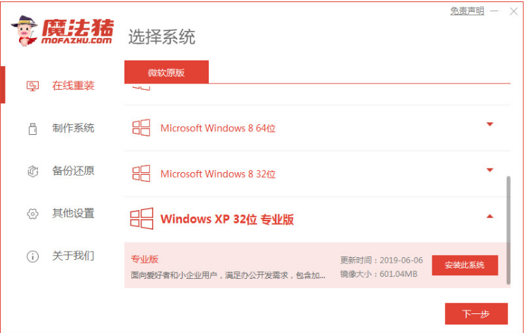 1、在浏览器上搜索并下载安装魔法猪并打开软件,选择windows XP 32位 专业版,点击下一步。
