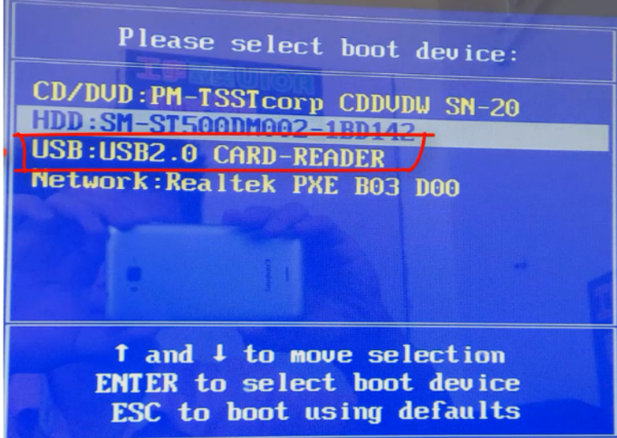 4、u盘插入需要重装的电脑上,重启电脑快速断续的按启动热键进入快速启动页面,选择带USB开头的u盘启动项回车键进入。