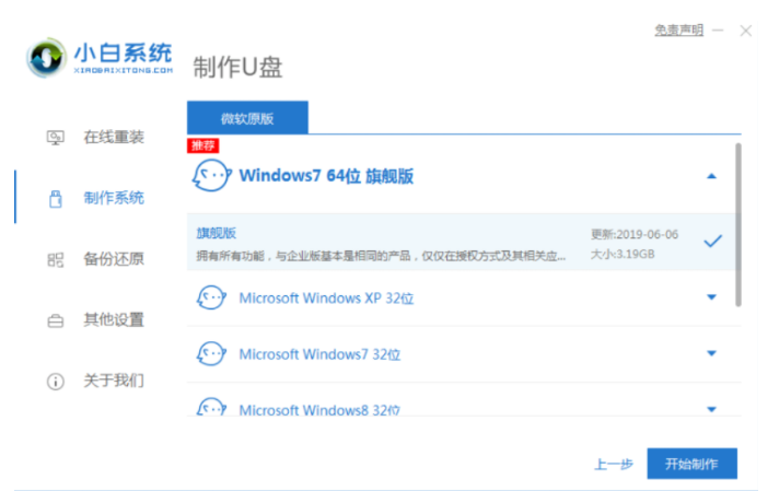 2、进入系统选择页面之后,选择我们需要安装的win7系统,点击“开始制作”。
