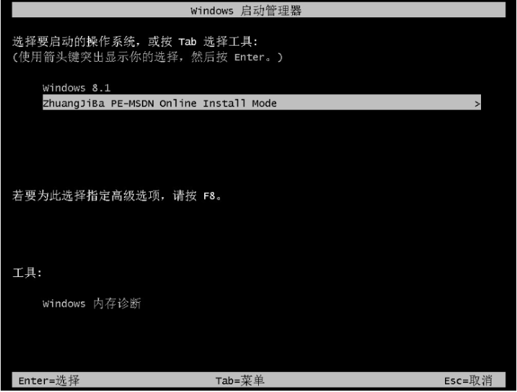 4、来到启动页面后选择zhuangjiba pe-msdn项进入pe系统内。