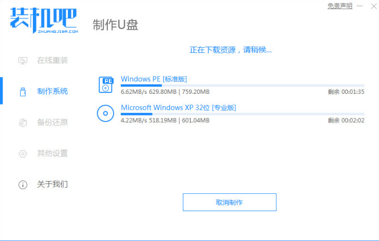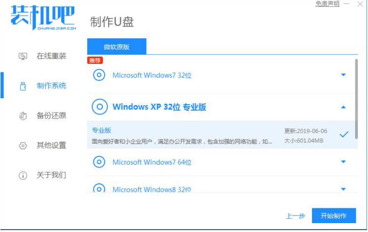 1、下载装机吧一键重装系统,准备一个U盘,选择制作系统,点击开始制作。