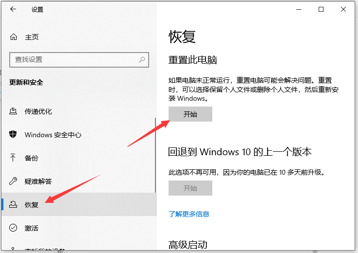 3、点击左侧的恢复,再选择重置此电脑,点击开始。(如果进不了系统,也可以尝试强制关机两次,第三次开机时会自动进入Windows RE修复环境,进入后点击高级选项,再选择重置此电脑)