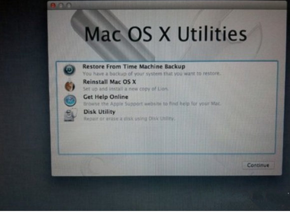 5.如果点击 Restore From Time Machine Backup,记着此时要将过去用作 Time Machine 备份的外置硬盘与 MacBook Air连接后 ,再点按Continue。