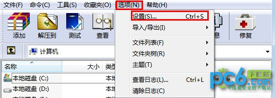 1.单击桌面上的开始按钮在搜索框中输入winrar找到该软件并启动,在菜单栏中单击【选项】标签,选择【设置】如下图: