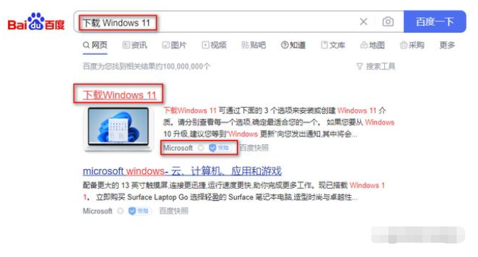 1、windows10如何更新到win11呢?首先我们打开百度搜索输入:"下载 windows 11",点击搜索结果,进入微软官网下载界面。
