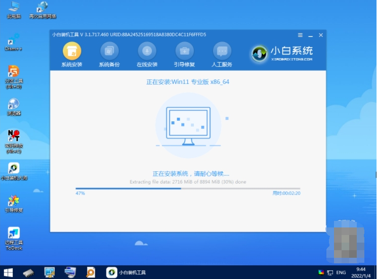 4、在pe系统内,小白装机工具会自动安装windows11系统,安装完成后立即重启。