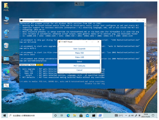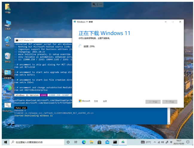 4、选择完成之后,脚本会自动下载 Windows 11 媒体创建工具并开始下载 Windows 11 安装镜像文件,这里和我们一般下载运行 Windows 11 媒体创建工具步骤基本类似。安装镜像下载完成之后,脚本会根据当前电脑的硬件情况开始处理下载的镜像。然后将处理好的镜像写入到 U 盘中,同时生成安装脚本。