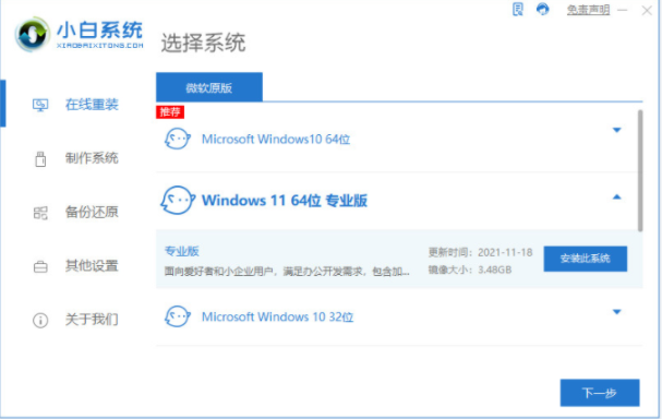 1、下载安装小白一键重装系统工具并打开,选择win11系统,点击下一步。