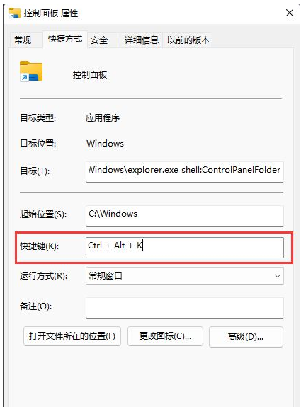 5、在【快捷方式】选项卡下设置快捷键,即可直接使用快捷键打开控制面板。